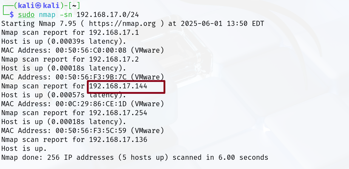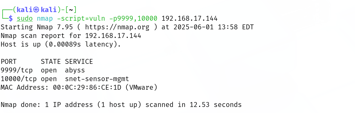 ┌──(kali㉿kali)-[~] └─$ sudo nmap -sT -sV -sC -O -p9999,10000 192.168.17.144 Starting Nmap 7.95 ( https://nmap.org ) at 2025-06-01 13:54 EDT Nmap scan report for 192.168.17.144 Host is up (0.00083s latency).