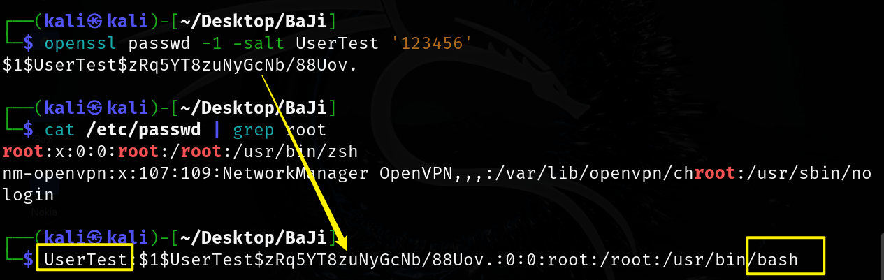 | openssl passwd -1 -salt UserTest '123456'		cat /etc/passwd | grep root
