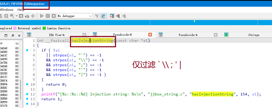 在文件中查找 hasInjectionString 函数,定位到 libleopard.so 文件,IDA 逆向分析: